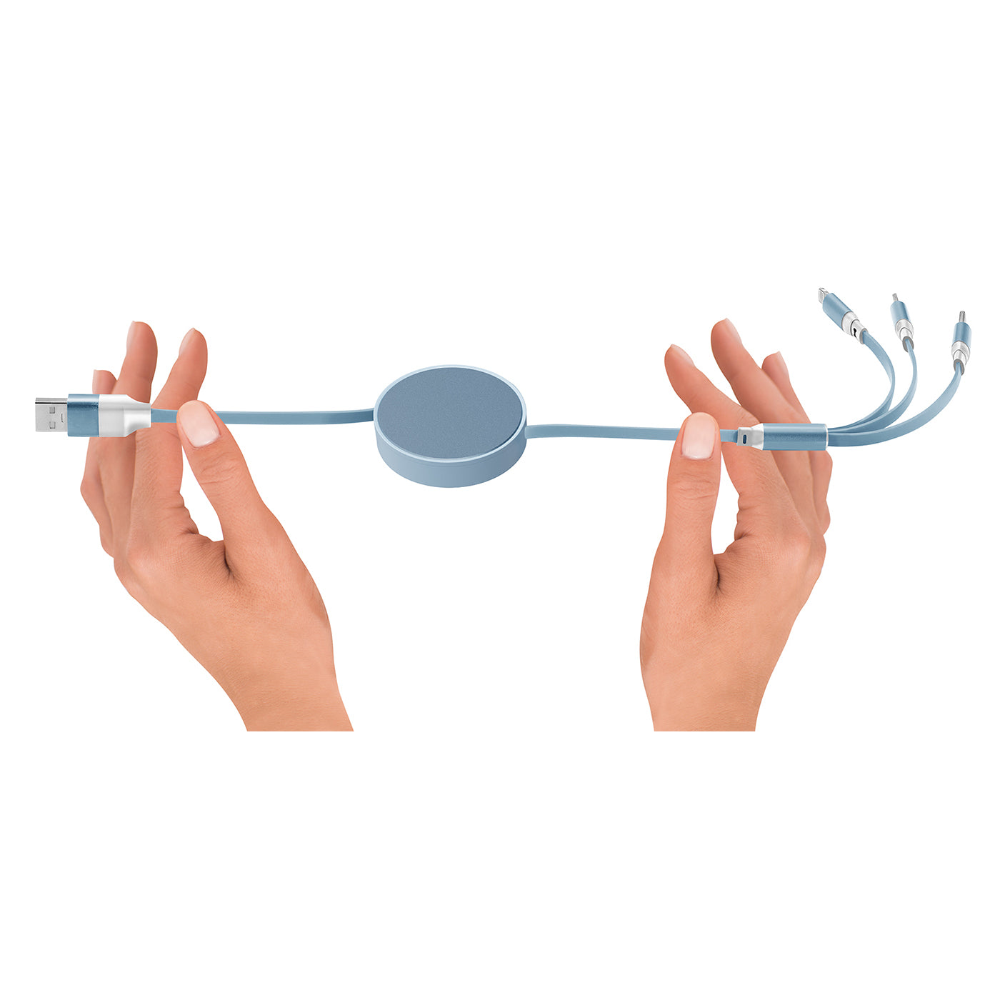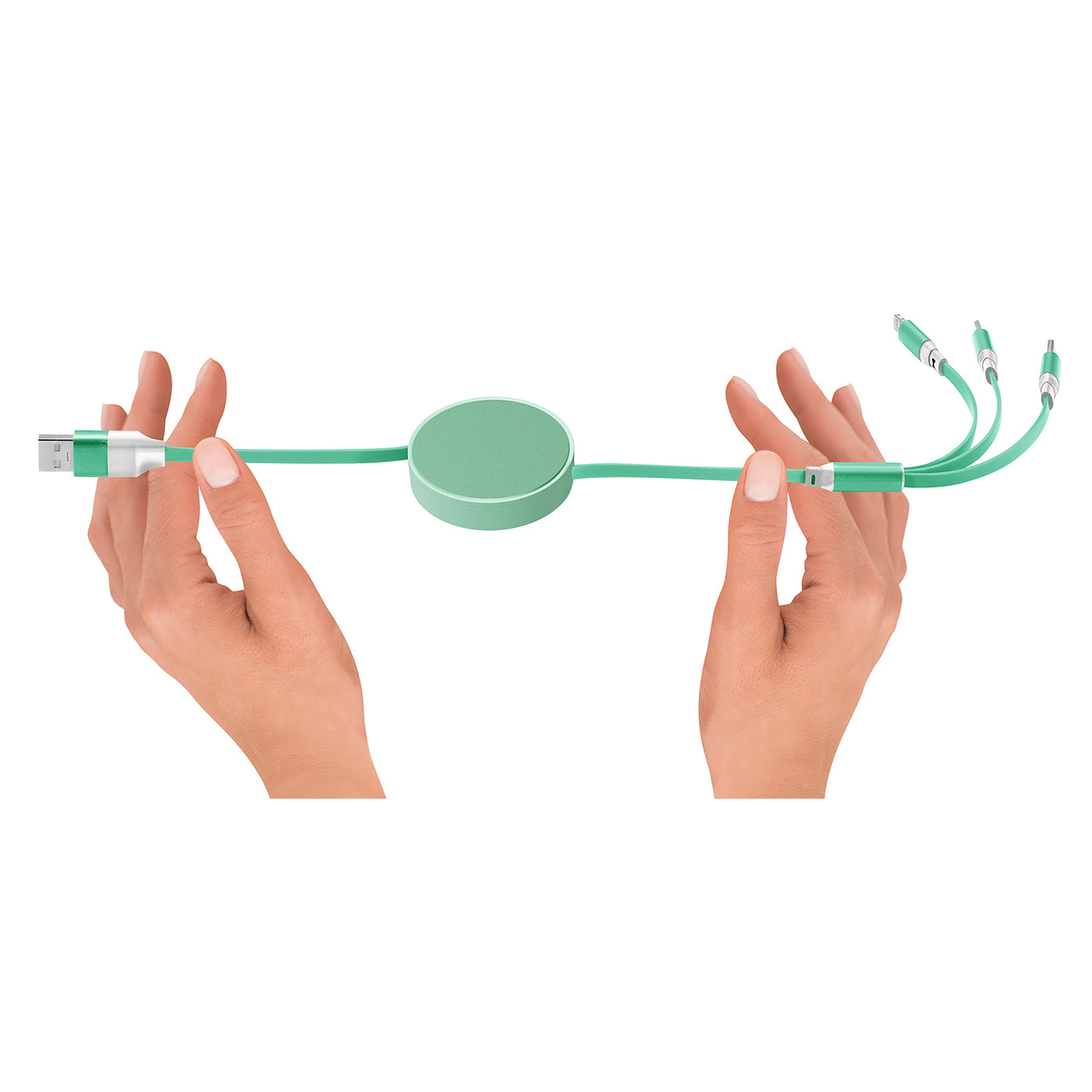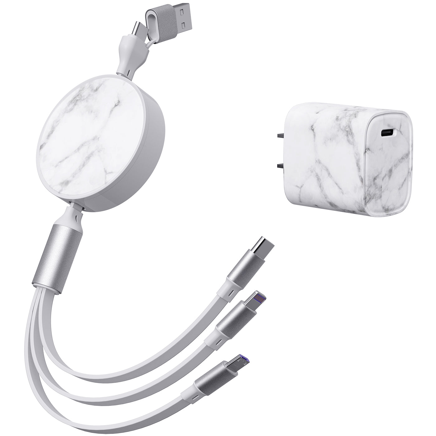 The 6-in-1 Retractable Cable is compatible with all phones, tablets, laptops, computers and other devices. These versatile charging cables are equipped with USB-C and USB-A inputs, as well as Micro USB, USB-C, and Lightning cable outputs. The included 20W Fast Charge USB-C Adapter fast charges up to three devices simultaneously. This charging cable is a convenient solution for eliminating tangled cords, reducing clutter, and simplifying your charging needs. The retractable design further enhances its portability and ease of use, making it the only device you will ever need at home or when traveling. Made with high-quality aluminum alloy on the cables and the housing itself, they are durable and resistant to heat and corrosion.