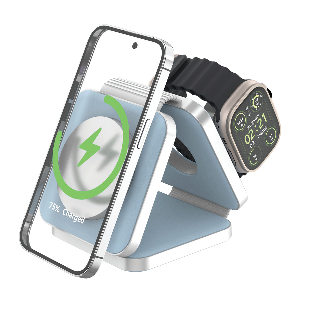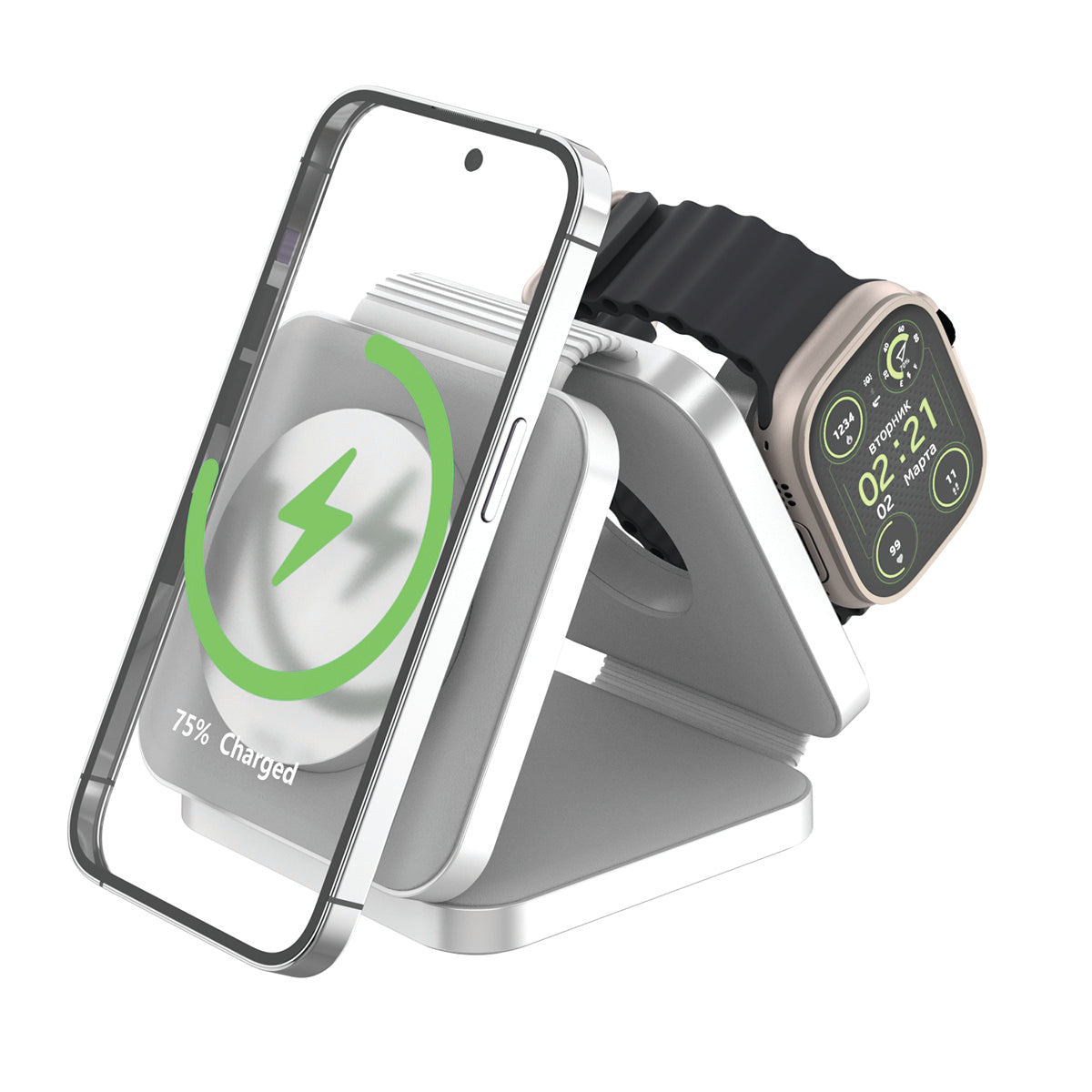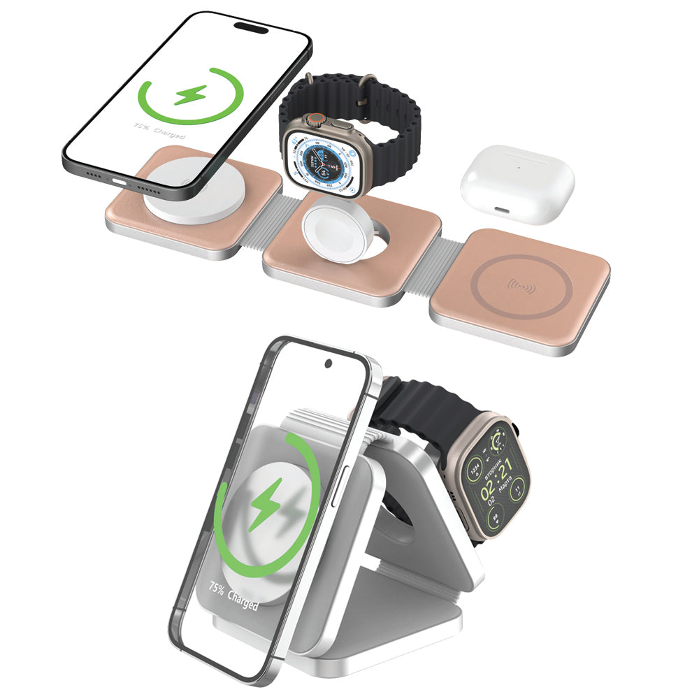 Charge your phone, smartwatch and AirPods or another phone simultaneously without the hassle of using multiple tangled charging cables or adapters. The smartwatch charger is now built-in, so you won’t need to carry your own. The patented Tri Fold Charging Station comes with a fast charge wall adaptor, which conveniently gives it the fastest possible wireless charge. Choose from either charging flat or click into stand mode to magnetically hold your phone for optimal viewing while charging. Lightweight and compact, it is easy to fold up making it ideal for your travels. Compatible with iPhone, Samsung, Google phone, Android or any other wirelessly compatible devices.